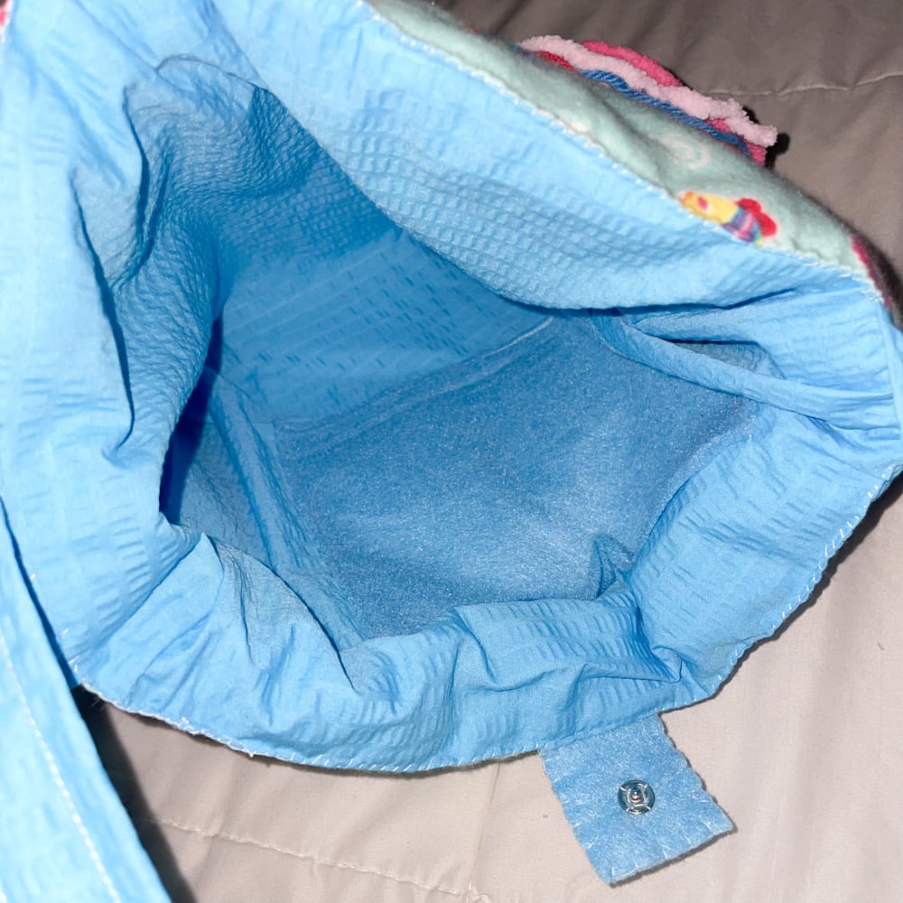 10 x 12 x 2 inches with a 25 inch strap, an added loop on the strap ready for keychains, a strong metal snap in the middle to keep things secure, and a 7 x 5 inner pocket <3